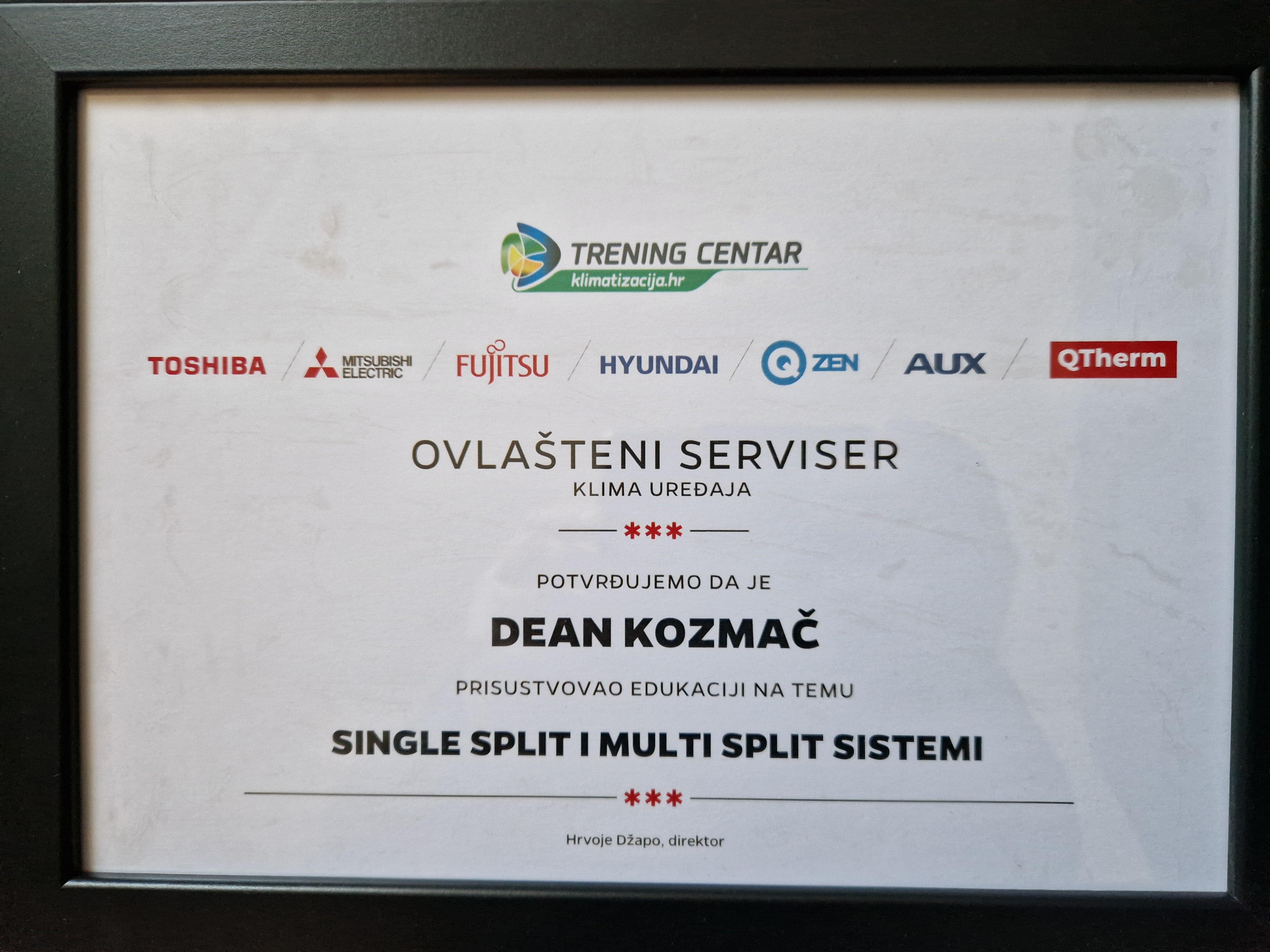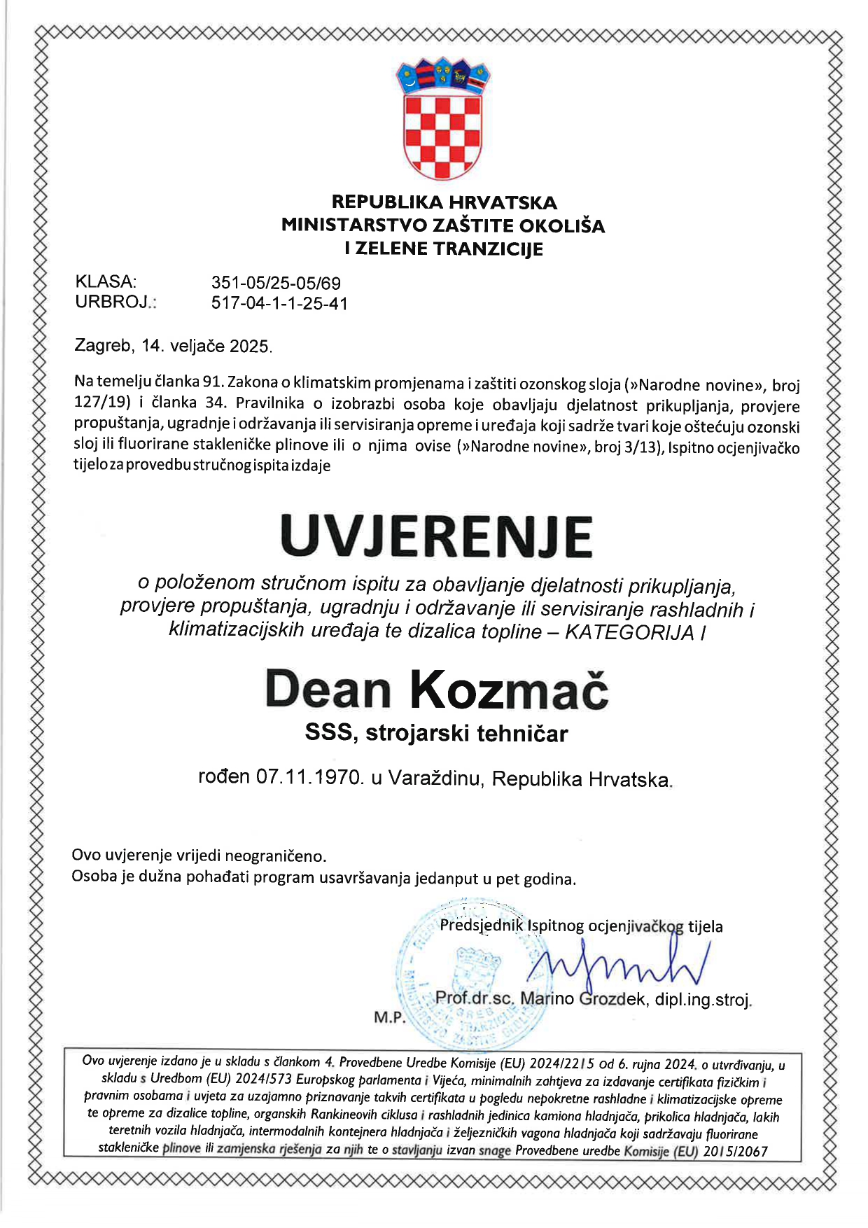 PotvrđenoMZOZT2025Certificirani instalater Single i Multi Split sustava