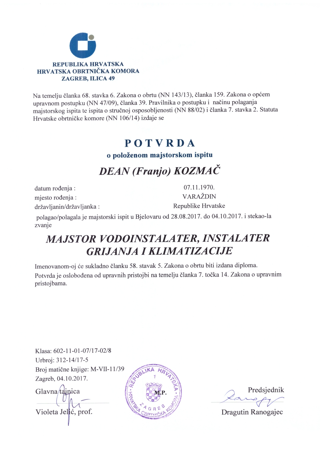 PotvrđenoObrtnička komora2017Majstor vodoinstalater, instalater grijanja i klimatizacije